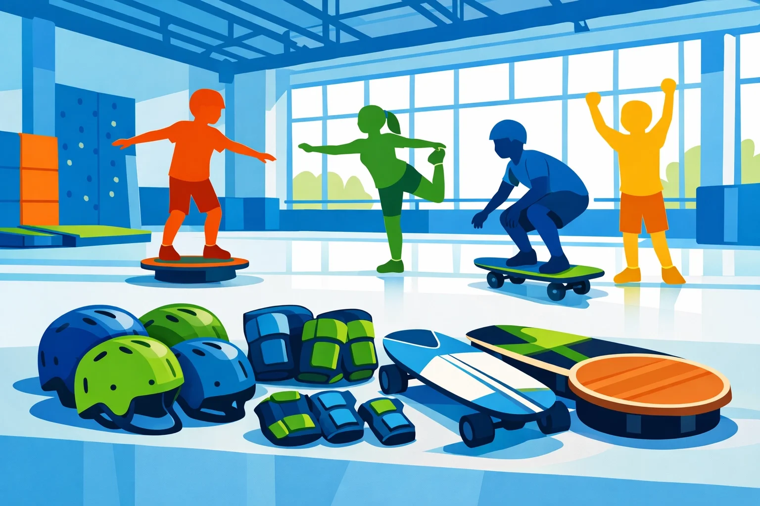 All gear: surfskate boards, balance boards, sound instruments, creative materials