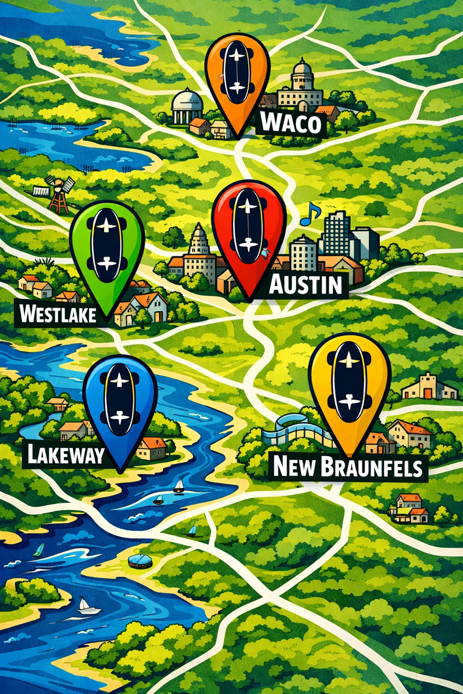 Greater Central Texas: New Braunfels, Waco, Belton, Temple, Round Rock, Cedar Park, Pflugerville, Georgetown, San Marcos, Kyle, Buda